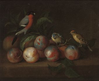 | A bullfinch and other birds with peaches | |