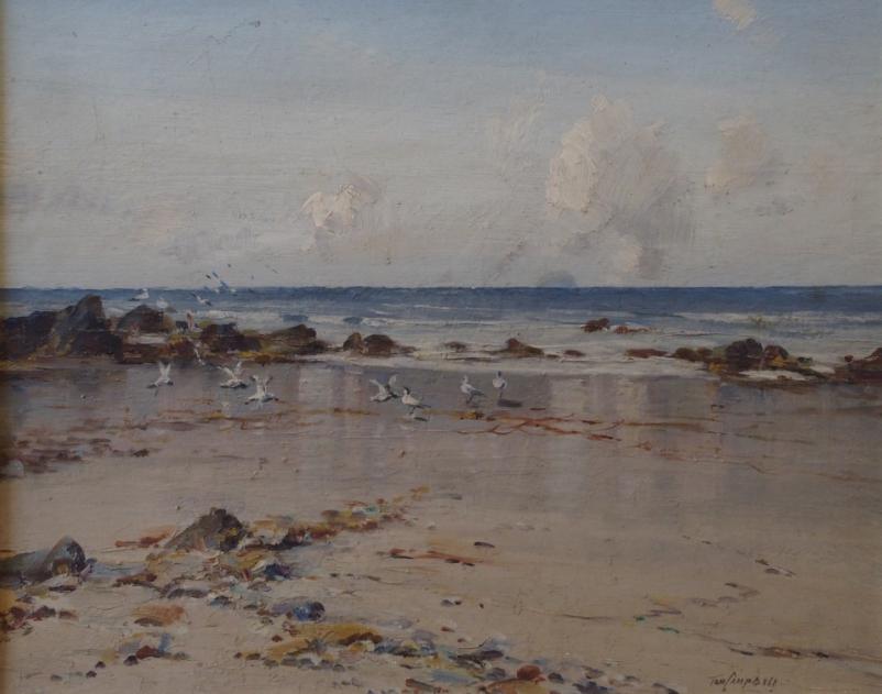 SEAGULLS ON A BEACH LOOKING TOWARDS AILSA CRAIG