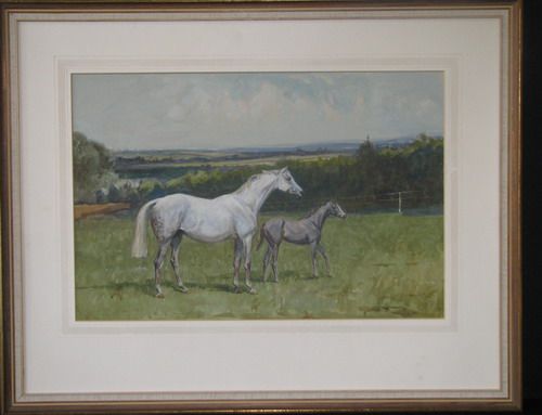 horse and foal in field overlooking landscape
