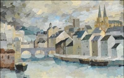 | View of an Italian town - river in the foreground, view to a bridge with three arches and a cathedral beyond | |