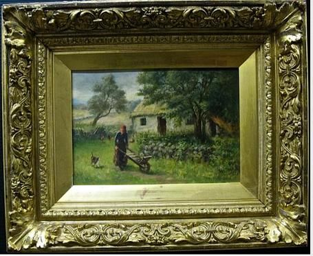 | WOMAN OUTSIDE OF THATCHED FARM HOUSE WITH WHEELBARROW, CAT AND CHICKENS | |