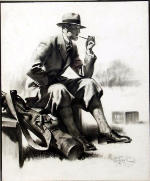 | Golfer seated on the green pipe in hand with golf clubs alongside | |