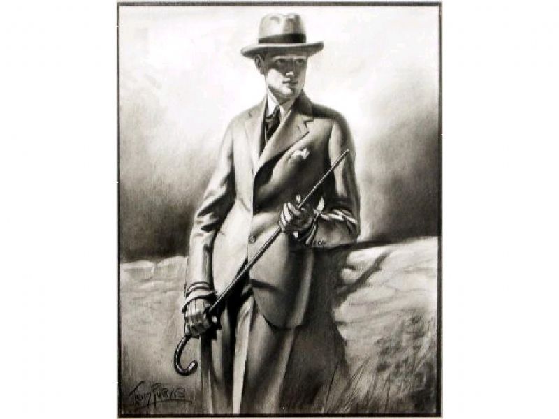 Young man in suit and gloves brandishing cane