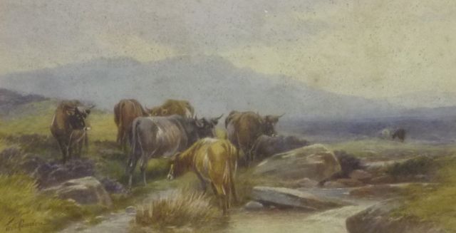 On the East Ockment, Dartmoor, Devon - Cattle watering in a brook with hills beyond
