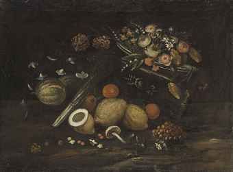 | Oranges, mushrooms and grapes on a ledge with roses, lilies and other flowers on a silver tray | |