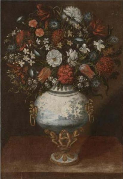 | STILL LIFE WITH FLOWERS IN A BLUE-AND-WHITE PORCELAIN-AND-GILT VASE, WITH MORNING-GLORY AND TULIPS | |