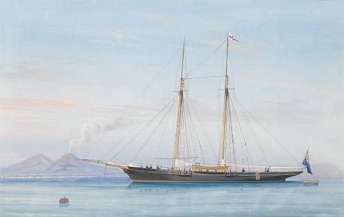 | A large 2-masted racing schooner of the Royal Dorset Yacht Club lying in the bay of Naples | |