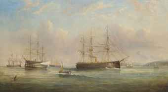 | Royal Navy ships of the Duke of Wellington class lying at anchor at Spithead, with one firing a salute to acknowledge the depart | |
