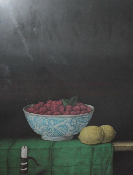 Still life with cherries in bowl and two lemons