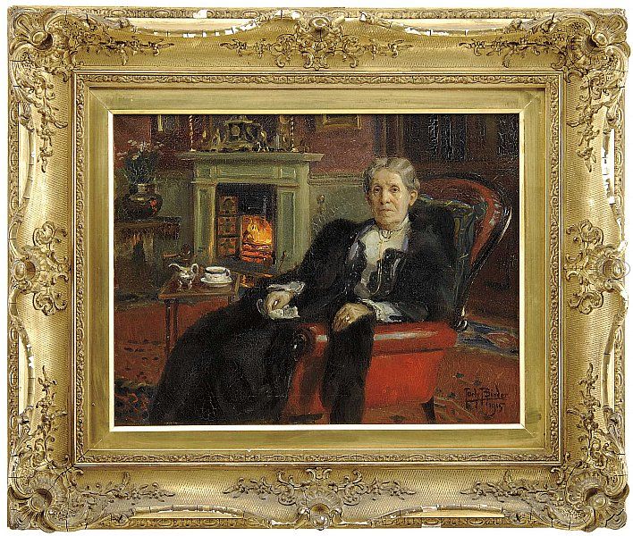 PORTRAIT OF MRS. STANBURY BY FIRE WITH CUP OF TEA.