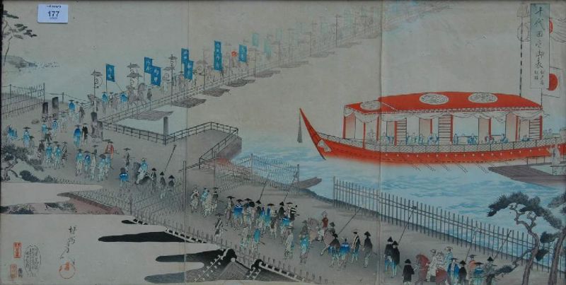 | A wood block triptych print depicting a procession of Samurai crossing a river bridge, a barge approaching the near bank carryin | |