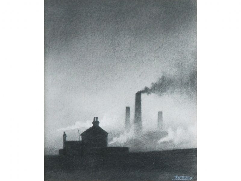 | Industrial landscape with silhouetted house and factory chimneys | |