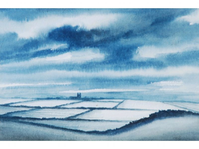 Snow covered landscape with distant church