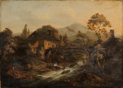 | Traveller on a bridge and an overshop mill, figures in the foreground, view to mountains beyond | |