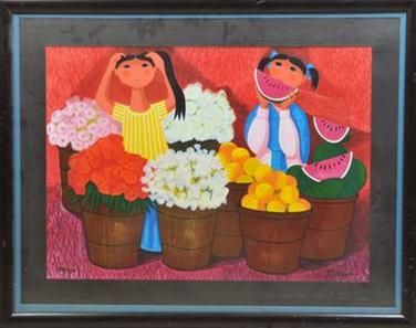 Niñas con flores y frutas.