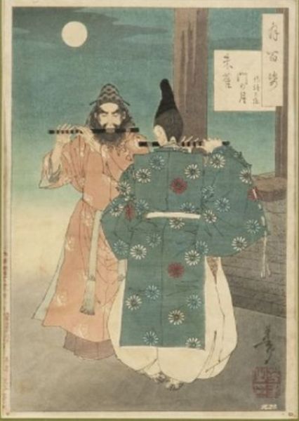 | Hakuga-no Sammi i niewidomy dworzanin grają na fletach przy bramie Suzakumon w Kioto | |