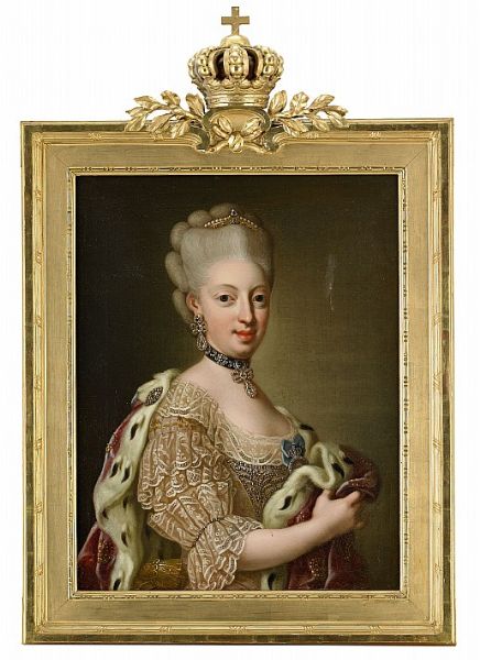 | Porträtt av drottning Sofia Magdalena klädd i en spetsprydd rosa klänning, bärandes en hermelinbrämad mantel i purpur - midjebil | |