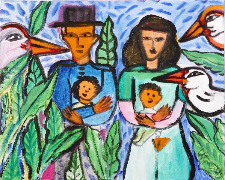 Figurkomposition med familj och fåglar