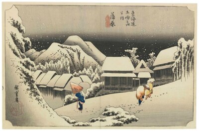 | KANBARA YORU NO YUKI (EVENING SNOW, KANBARA), FROM THE SERIES TOKAIDO GOJUSAN TSUGI NO UCHI (THE FIFTY-THREE STATIONS OF THE TOK | |