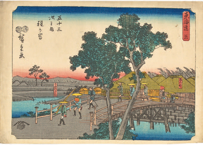 | Two chuban yoko-e of the series Tokaido Gojusan tsugi, The fifty three stations of Tokaido, stations Nihonbashi and Hodogaya. | |