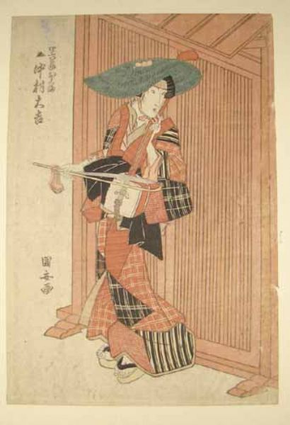 | Geisha (Schauspielerin) stehend mit breitem Hut, ein Streichinstrument spielend | |