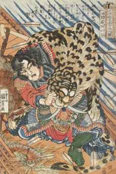 | Katsuenra Geshoshichi using a tiger skin to defend himself from arrows; and Kosonsho with his magic sword conjuring a dragon ami | |