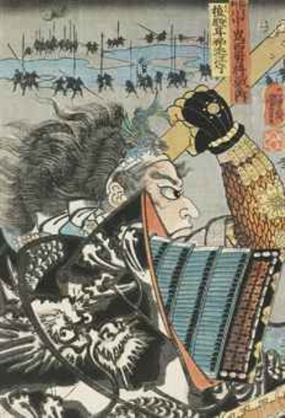 | The Uesugi clan general Amakasu Omi no kami in profile wielding a naginata | |