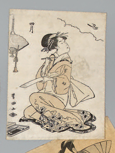 | Chuban tate-e of a series on the twelve months of the year, fourth month. Young woman writing a letter, a fan decorated with a c | |