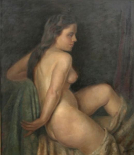 Sitzender weiblicher Halbakt mit langem Haar im Profil nach rechts