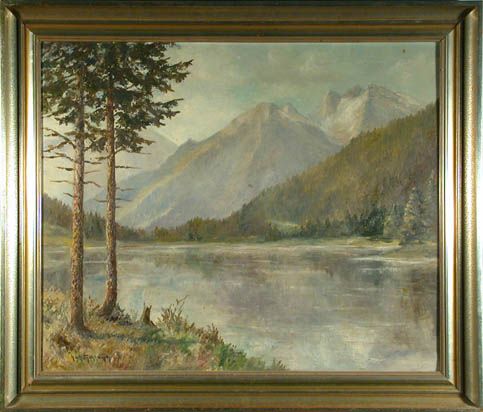 | Baumumstandener Bergsee, im Vordergrund zwei einsame Tannen, im Hintergrund die schneebedeckten Gipfel der Alpen | |