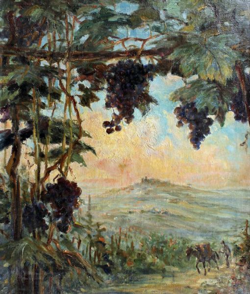 | Italian landscape as viewed from a vineyard with fruiting vines to the foreground | |