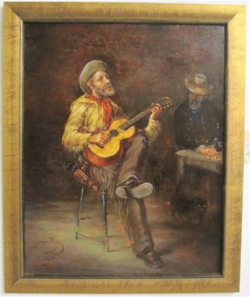 | depicting a Wild West salon scene with a cowboy playing the guitar while a man seated at a table looks on. | |