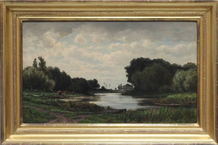 | Über Flusslandschaft mit weidenden Kühen, Kuhirten und im Hintergrund Bauernkate aufziehendes Gewitter | |