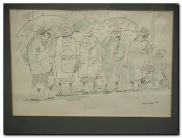 Ladies at a bus stop in the rain