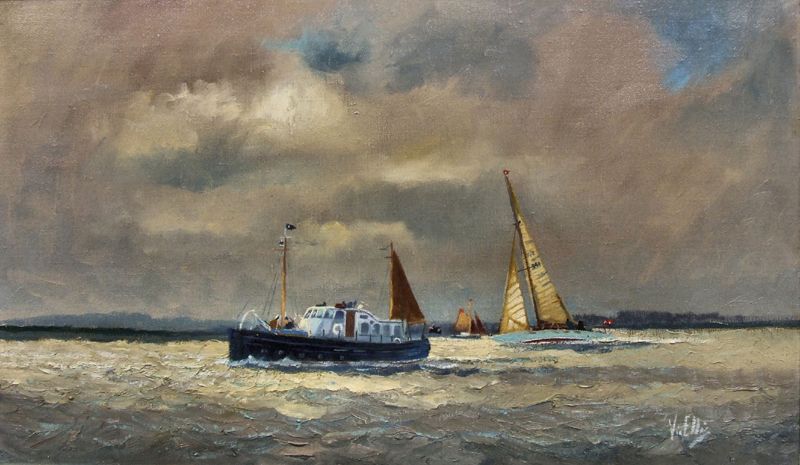 M.V. Paul Star and gaff cutter "Oberon" in choppy seas off coast