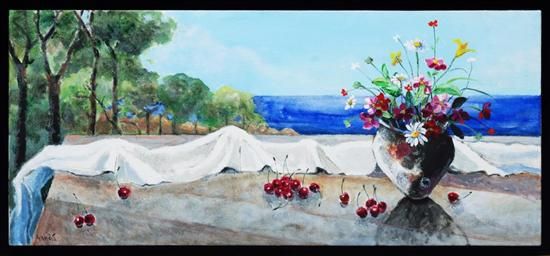 Bodegón con flores y cerezas