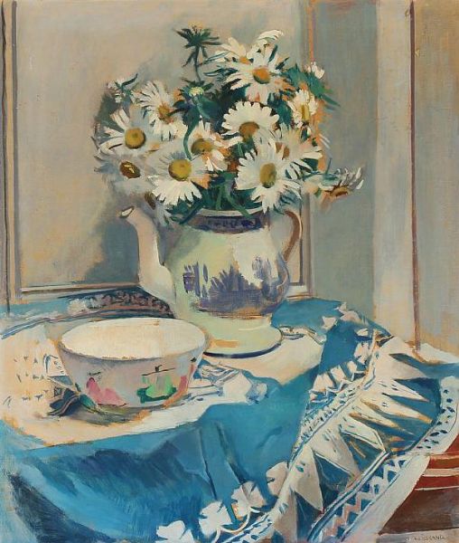| Still Life with Earthenware and flowers on a blue tablecloth | |