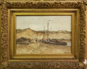 Loading barges on a shore, (recto), figures on a village street, (verso)