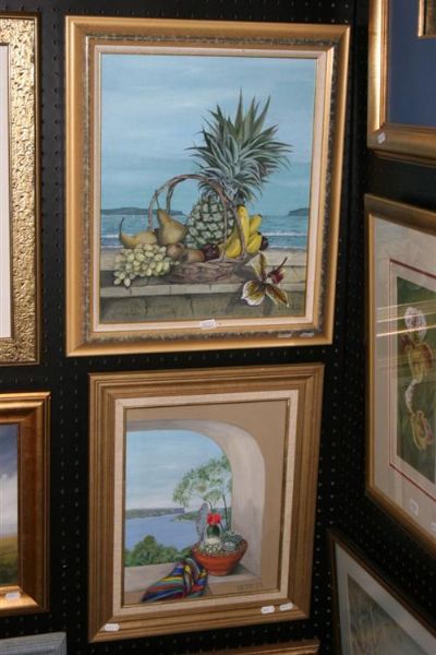 Pineapple, Bananas, Grapes, Kiwi Fruit, Plums and Flower in Front of Harbour