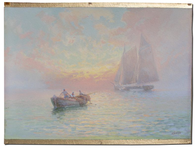 Fishermen with Sailing Vessel at Sunrise in the Harbor