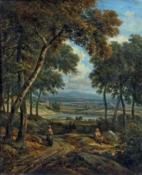 Paysage en sous-bois animé d'un berger et d'une paysanne