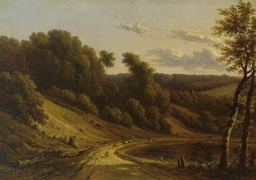 | Sommerliche Teich- und Hügellandschaft mit Schafherde und Figurenstaffage | |