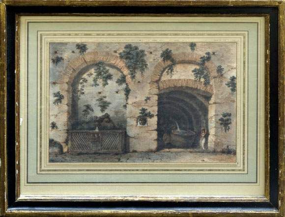 | Personnages dans des ruines romaines et tombeau antique transformé en fontaine. | |