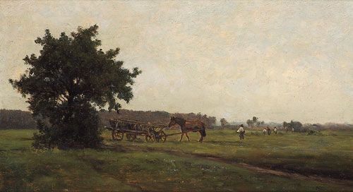 Wiesenlandschaft mit Bauern bei der Heuernte