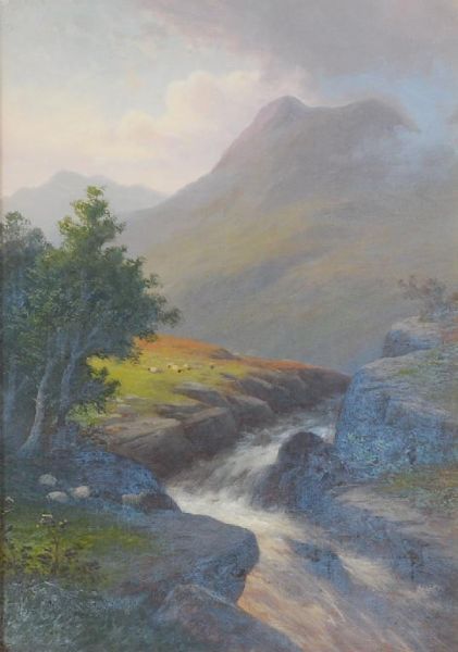 | Scottish highland landscapes with river rapids, trees and sheep | |