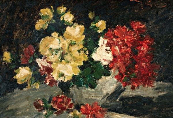Vaas met rode en gele bloemen