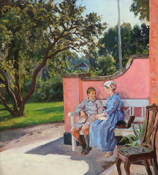 | A boy and a woman sitting on a bench in front of a house, summer | |