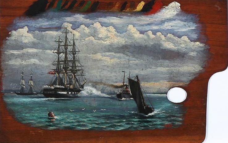 Three seascapes, hence one on the artist's palette