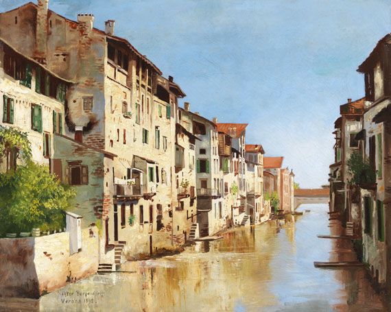 | Blick auf Häuser an einem kleinen Kanal in Verona | |