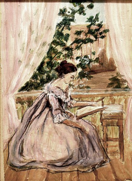 | Junge Dame beim Sticken auf ihrem Balkon | |